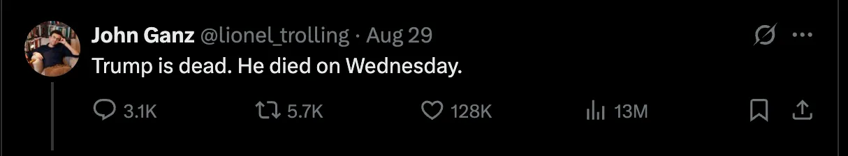 Last Friday evening, unable to watch the Mets game due to a broadcasting blackout, I tweeted, “Trump is Dead. He died on Wednesday.” Why? Well, he hadn’t been seen for a couple of days, and it seemed sort of funny to me. I didn’t really have any intent while doing this. It was, in the parlance of our times, a shitpost. And not even that, because that implies a desire to troll or disconcert. I didn’t have any developed motive; I had an impulse. I noticed that some of my funnier friends seemed to think it was funny and were liking it. (Some likes are better than others.) A success! I went to bed.